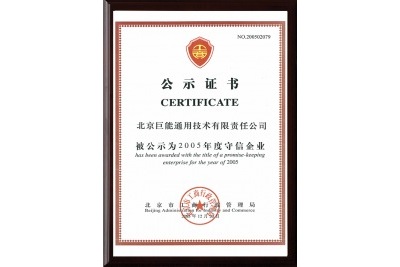 2005年獲得北京市工商行政管理局頒發(fā)的2005年度守信企業(yè),并在網(wǎng)上公示